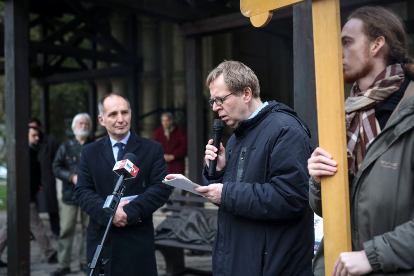 A keresztút első állomása előtt Szőke Péter, a Sant’Egidio budapesti vezetője hangsúlyozta, hogy a keresztények nagypénteken arra kapnak meghívást, hogy a keresztúton járva kövessék az Urat, és mindennapjaikban keressék Istent: „ De vajon jó helyen keressük-e? Ma ott akarjuk keresni Jézust a hajléktalan emberek között, a magányos idősek között, a kicsinyek, a kitaszítottak, a menekültek, a be nem fogadottak között. A Hajléktalan Jézus szobra segít rácsodálkozni erre a titokra. A keresztút állomásai a fájdalom helyei lesznek ebben a városban, ebben a kerületben, ahol Krisztus bizonyosan megfordult már keresztútja során.”