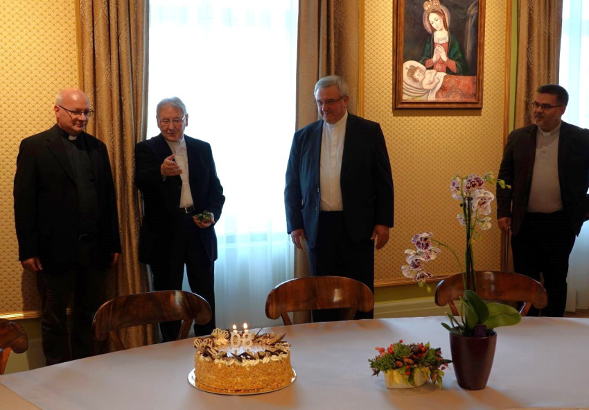 A Győri Egyházmegye Püspöki Hivatalának munkatársai bensőséges ünnepség keretében köszöntötték születésnapja alkalmából Németh Lászlót.