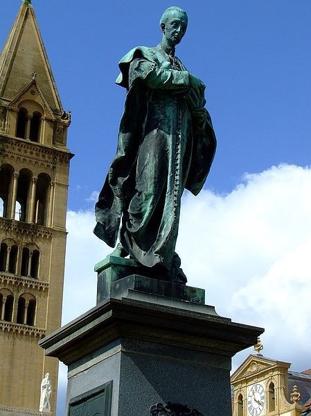 Végrendeletében külön kérte, hogy emlékének tárgyi manifesztumai ne keletkezzenek, sőt a városi tanácsban elhelyezett (1834. április 15.) festményét is szedjék le. Ennek ellenére a város 1856 körül utcát nevezett el róla a hajdani líceum, majd püspöki bibliotéka épületénél, majd 1893. november 12-én Pécs város „hálás közönsége” 10 000 forintnyi adományból szobrot leplezett le emlékére, amelyet Kiss György szobrászművész készített el.