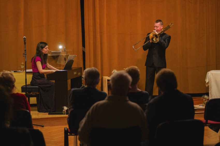 Rozina-Góbor Brigitta zongorán kísérte férjét, Rozina Gábort, aki harsonán játszott. A házaspár romantikus zeneszerzők műveiből állított össze válogatást, a zeneművek között pedig a szerzőkhöz kapcsolódó anekdotákat is megosztottak a hallgatósággal. A zenészházaspár többek között Launy Grøndahl, illetve Carl Maria von Weber műveiből válogatott, de Máté Péter dallamai is felcsendültek az eseményen.