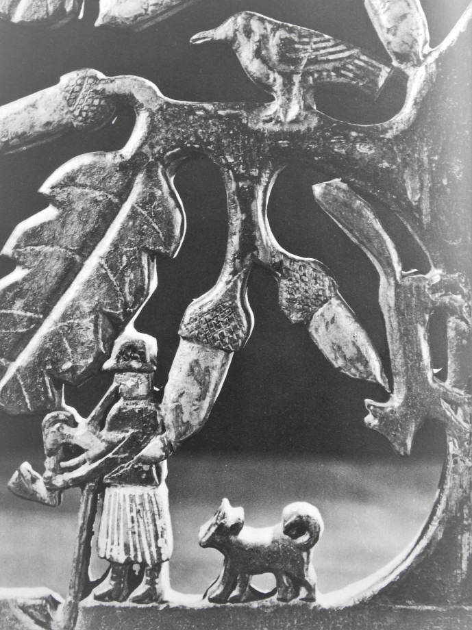 Kép: Dudás juhász a kutyájával, tölgyfa alatt (Padtámla részlete, Lőrincz Pál juhász munkája, Karancskeszi, Nógrád megye, 1902; Forrás: Hofer Tamás–Fél Edit: Magyar népművészet, Corvina, 1977)