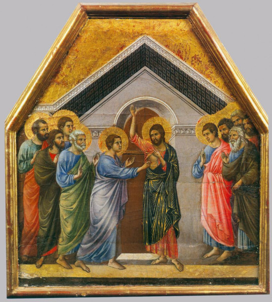 Kép: Duccio di Buoninsegna: Tamás hitetlensége (1308–11; Maestà, Siena, dóm)