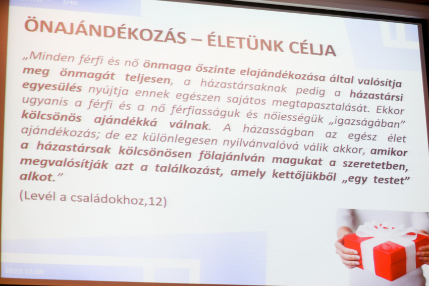 Hangsúlyozták, az Egyház tanítása a legjobbat akarja az embernek, ez a tanítás az egész emberből indul ki, akit Isten a saját képére teremtett, és az üdvösségre hívott meg. Van-e jelentése a testnek vagy élvezeti cikknek tekintjük? – arra mutattak rá, milyen lavinát indított el a szétválasztás. Ha az Egyház tanítása szerint bűnnek tekintjük azt, amivel a szétválasztás jár, látni kell, hogy ennek milyen romboló hatása van az emberre és a házasságra.