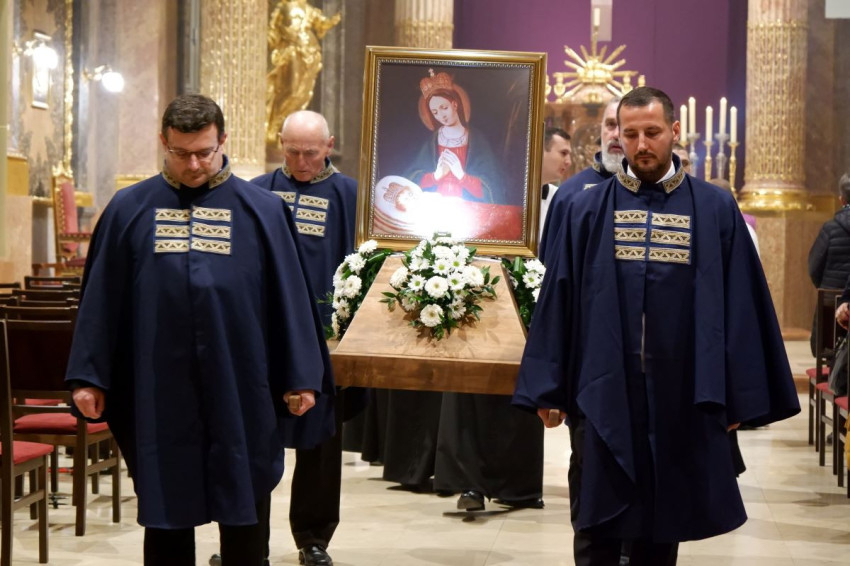 A megváltás művének aktualitása Jézust is megrendíti, hallottuk a mai evangéliumban (Jn 12,20–33). Eljött az óra számunkra is, hogy a megváltás örömhíre átformálja a világot, új lendületet adjon a mi életünknek is. Jézus engedelmes az Atya iránt, engedi, hogy a világ kitaszítsa magából. Tudja, ha fölemelkedik a földről, mindenkit magához vonz (vö. Jn 12,32). Szeretné ezt a vonzását kiterjeszteni minden emberre, szeretné kiterjeszteni ránk. Jó megérkezni a Szűzanya lábához, jó megtapasztalni azt az örömöt, amivel fogad bennünket Mennyei Édesanyánk. Engedelmességre akar bennünket tanítani. Mária szívébe véste Jézus szavait, az Ő szavai vezérelték minden cselekedetében, minden elgondolásában. Fia köré gyűjt bennünket, aki azért jött, hogy keresse és megmentse, ami veszni indult, hogy életünk legyen és bőségben legyen (vö. Jn 10,10).