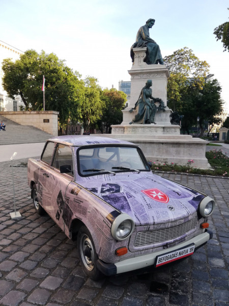 Ehhez a témához kapcsolódik a Magyar Nemzeti Múzeumban a B címmel rendezett kiállítás. Az épület körcsarnokában egy informatív, képekben gazdag, remek áttekintést láthatunk az 1989-ben történtekről, az úgynevezett páneurópai piknikről. Már a Múzeumkertben az ember szemébe ötlik egy korabeli újságokkal tapétázott Trabant, amint az Arany János-szobor jobbján várja a nosztalgiázó látogatókat. Rajta a máltai kereszt. Találó, hogy ide állították ezt az autót, hiszen a Trabant volt a népautó az NDK-sok számára, ahogyan nekünk, magyaroknak is, az egész rendszer jelképeként. Viszonylagos olcsósága, könnyű javíthatósága hamar népszerűvé tette az autóvezetők körében, meg hát ehhez lehetett hozzáférni akkoriban a Merkur átadótelepein.