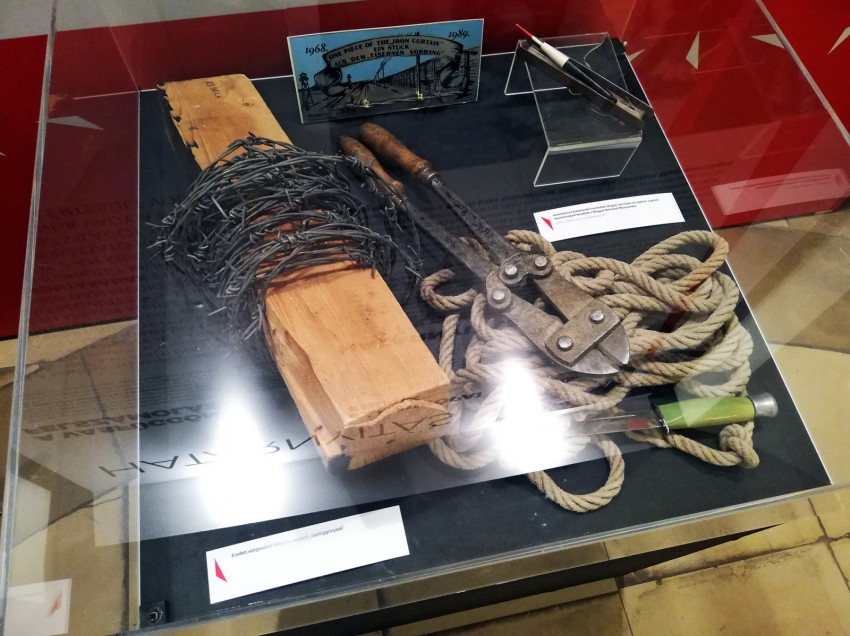 A tárlat vitrinjeiben láthatjuk az egykori határzár, a szögesdrót egy darabját, az átvágásához használt fogót, kötelet és más eszközöket.