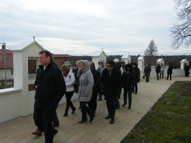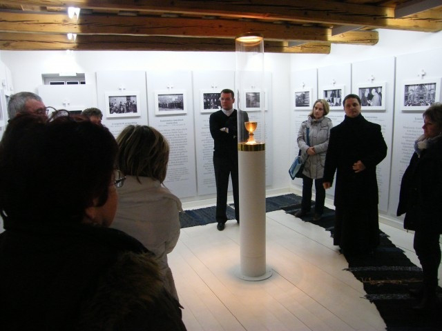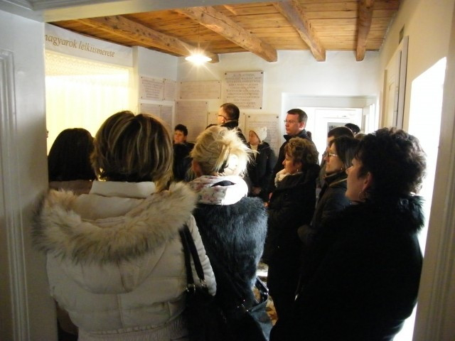 A szentmise után Fukszberger Imre polgármester vezette körbe az iskola tanárait és dolgozóit Mindszenty József szülőházában. A kis parasztházban a felújítás után méltó helyre kerültek a bíboros használati tárgyai, amelyek között megtekinthetőek korabeli bútorok, családi fotók és dokumentumok. Szobáról szobára járva a bíboros életének egy-egy részlete tárul a látogatók elé. A „fehér” szobában életét 12 állomásban foglalja össze a kiállítás, s itt helyezték el az aranymiséjén használt kelyhet is. Egy másik, elsötétített szobában a börtönéveibe kaphatunk bepillantást. Csehimindszent polgármestere minden tárgyról, emléktábláról, fényképről sok érdekességet osztott meg a jelenlévőkkel, akik azt is megtudták, hogy maga is a családhoz tartozik: a bíboros testvérének unokájaként vezeti a falu közösségét.