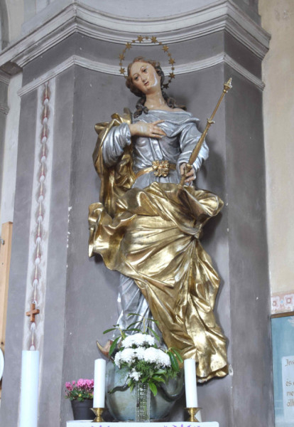 Jelentős művészi értéket képvisel a jobb oldali diadalívpillér előtt elhelyezett nagy méretű késő barokk-rokokó, tölgyfaberakásos Szűz Mária faragott hársfaszobor, amely azonban nem a templom korábbi berendezésének maradványa, hanem a feljegyzések szerint az 1862-es felújítást követően, 1866-ban győri búcsúsok hozták Jásdra.