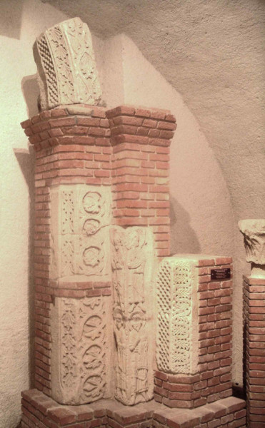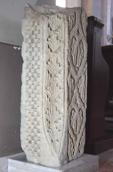 Az 1991-ben a kereszttalapzatból előkerült belső sarokelem a templomban elhelyezve (Fotó: Simon Anna, 2024)