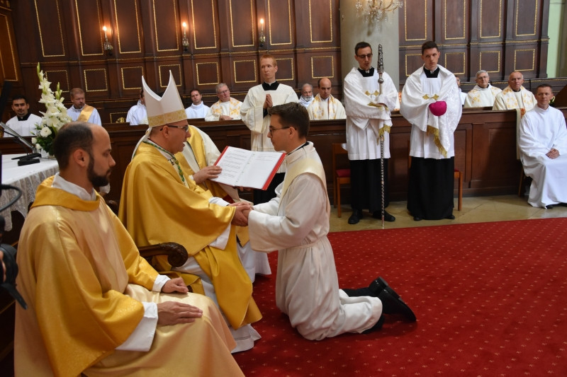 „Az olvasmányban hallottuk, hogy »az Úr kiválasztotta Lévi törzsét, hogy színe előtt álljanak és szolgáljanak neki«. Téged is hív az Ő szolgálatára az oltárnál, ahogy az ígéretekben elhangzik: az Ő szent testét és vérét fogod érinteni és a híveknek nyújtani. A szerpap speciális küldetése a diakónia, ahogy a fölszentelő imádság mondja: az asztalszolgálat, a betegekkel és a szegényekkel való törődés. Most, a szentelésben ezekhez kapod meg Isten ajándékait, karizmáit. Kívánom, hogy plébánosoddal összhangban tudd betölteni szent szolgálatodat” – mondta Marton Zsolt.