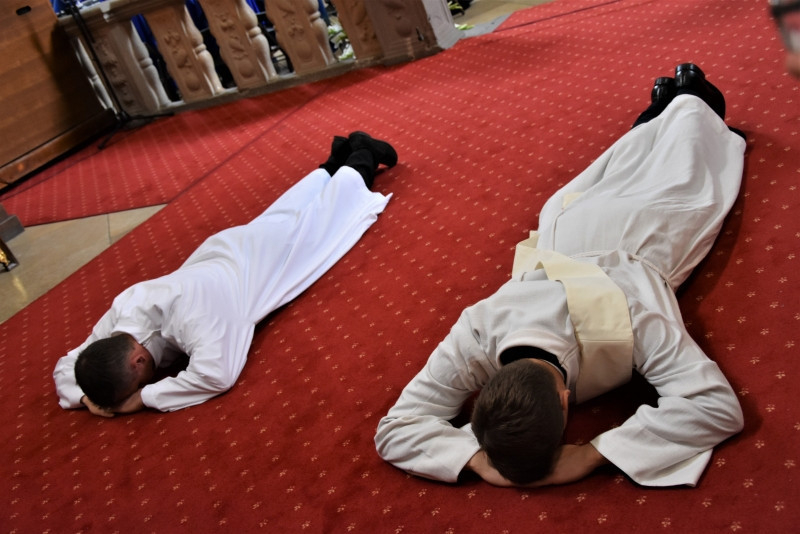 A prédikációt a szentelendők ígérete követte, majd a Mindenszentek litániájával folytatódott a szertartás. A jelöltek leborultak a földre, kifejezve ezzel a teljes önátadást, azt, hogy életüket Isten akaratának rendelik alá. Majd Fazakas Zsoltot állandó diakónussá szentelte a püspök, és az új diakónus megkapta liturgikus ruháját, illetve Krisztus evangéliumát.