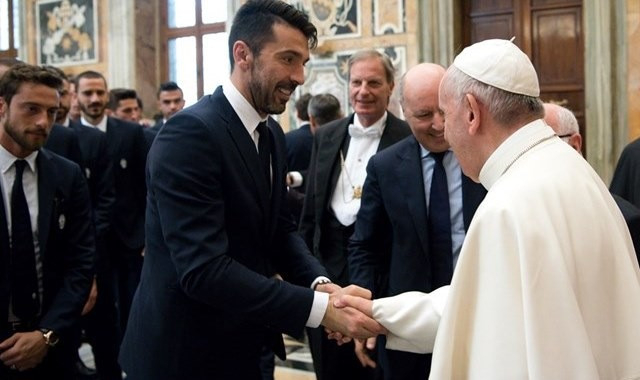 Többek között a világbajnok Buffon, valamint Higuain, Dybala, Biglia, valamint az edzők, Allegri és Inzaghi is kezet szorítottak a szentatyával. A focisták egy mezzel és egy focilabdával ajándékozták meg a pápát, aki a sport fontosságáról beszélt, és gratulált a két csapat játékosainak az Olasz Kupa döntőjébe való bejutásért. Mint mondta, olyan csapatokról van szó, amelyek nagy népszerűségnek örvendenek; és ez még inkább arra ösztönzi a játékosokat, hogy tanúságot tegyenek a sport hiteles értékeiről.