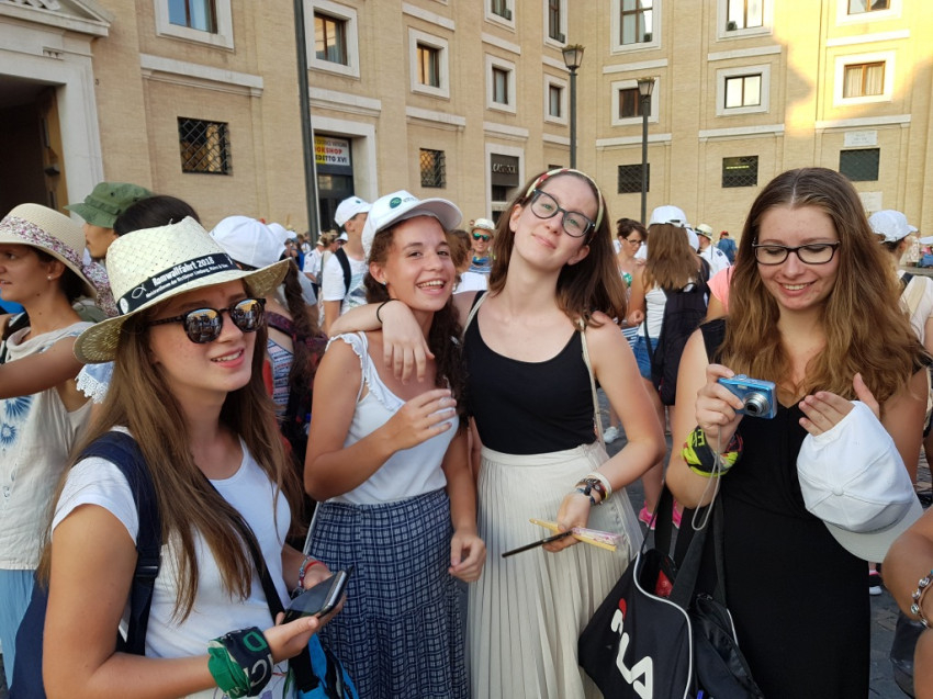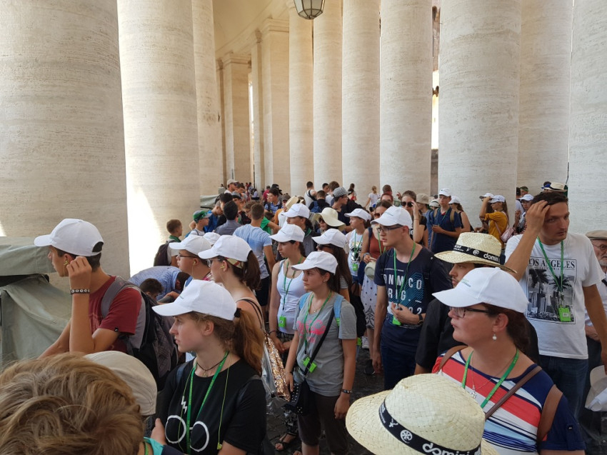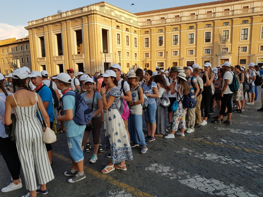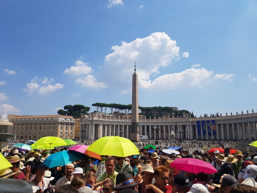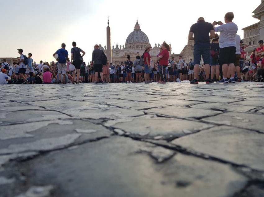 Kedden reggel a siófokiak szálláshelyén közös szentmisén vettünk részt, majd nyakunkba vettük az Örök Várost, hogy jó néhány nevezetességét megnézzük. Délután elindultunk a Szent Péter térre, hogy az audiencián találkozzunk Ferenc pápával. A világ különböző országaiból érkezett mintegy hatvanezer ministráns várt arra, hogy láthassa a Szentatyát és hallgassa tanítását. A többórás várakozás a forróság ellenére jó hangulatban telt, sapkákat, kendőket cserélgettek a különböző nemzetiségű fiatalok, és egy gitár is előkerült a kaposvári csapatnál, hogy örömzenéléssel és dicsőítéssel tegyük tartalmasabbá az időt. Este fél 7 tájban megérkezett Ferenc pápa, aki pápamobilon végigment a téren, a ministránsok ovációjától kísérve. Meghallgattuk tanítását, válaszolt jó néhány kérdésre, majd közösen imádkoztunk. Az audiencia után visszatértünk szálláshelyünkre, hogy kipihenjük a nap fáradalmait.