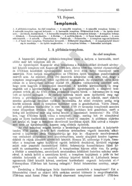 Az első kaposvári plébános, Vörös József 1716-ban foglalta el hivatalát. Hoss József kötetében ismerteti a kaposvári plébánosok neveit és működésük főbb eredményeit a kezdetektől a 20. század elejéig. Külön fejezetet szentelt a plébánia világi kisegítőinek: a templomatyák, kántorok felsorolásának is. Részletesen megismerkedhetünk a városban található három templom történetével, építésük körülményeivel; rajzokkal, illetve fotókkal illusztrált képet kapunk az épületek korabeli állapotáról. A szerző külön fejezetet szentelt a más egyházi tulajdonban lévő épületek bemutatásának és az egyházközség korabeli vagyoni helyzetének ismertetésének.