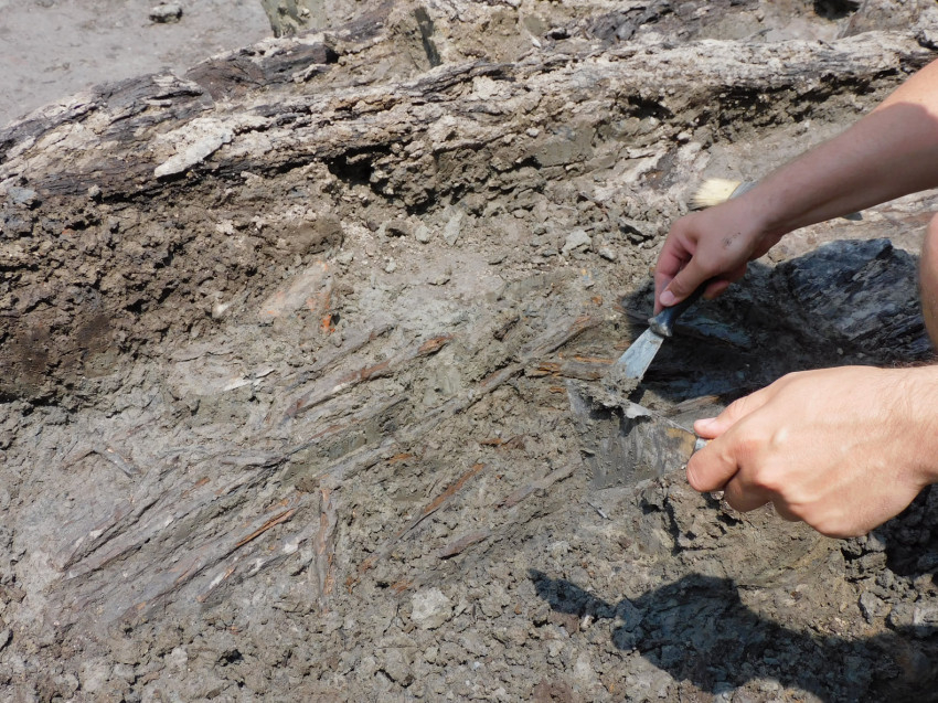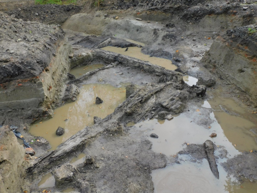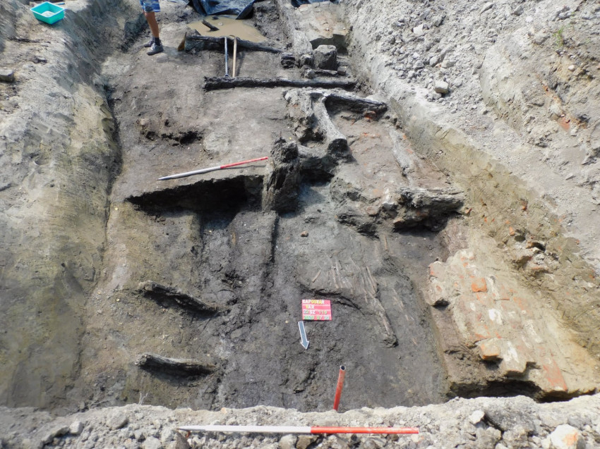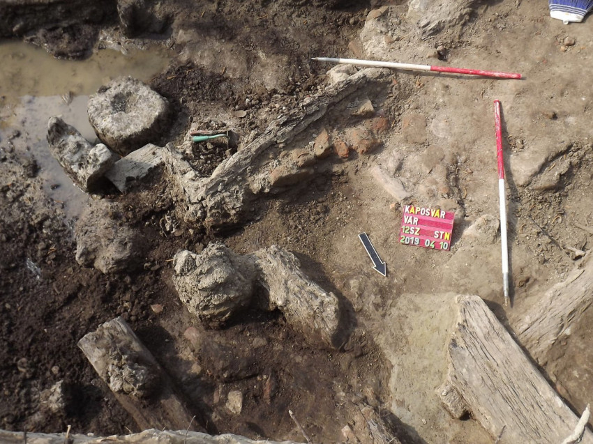A földbe ugyanis egykor 1–2 méter mélyen cölöpsorokat ástak, amelyeket ágakkal megfontak, és néhol gerendákkal meg is csapoltak – magyarázta az ősi technikát a régész. – Ezek közé földet töltöttek, így egy széles és több méter magas földfalat emeltek. Az északkeleti részen tudtuk megnyitni a legnagyobb területet. A cölöpsorok itt 9–10 méter szélességben követték egymást. A külső cölöpsornál farkasfogszerűen elhelyezett rövidebb gerendákkal, míg a belső kilencedik sornál egy nagy, hosszú gerendával csapolták meg a cölöpöket. A két sor között hosszú és vastag merevítő gerendák feküdtek. 2019-ben egyébként egy másik feltárt területen is hasonló szerkezetet figyeltünk meg. Itt a cölöpök mellett rácsszerűen lerakott, egymásba csapolt, fekvő gerendákat találtunk. A mocsaras talaj miatt vesszőfonatot, vékony deszkasort fektettek le, majd erre töltötték rá a palánk földjét, amely 60–80 centiméter magasan volt követhető. A sánc külső cölöpsora előtt egy szűkülő falú árok húzódott, amelynek aljába kifelé néző, kihegyezett karókat szúrtak. Keleten, északkeleten a palánk nagyjából 15 méter távolságból keríthette a téglafalakat, a déli oldalnál viszont a palánk a téglafalakhoz közel futott, aminek a Kapos közelsége lehet az oka.