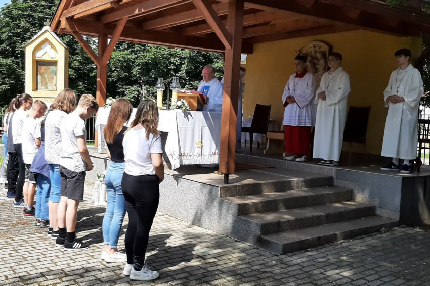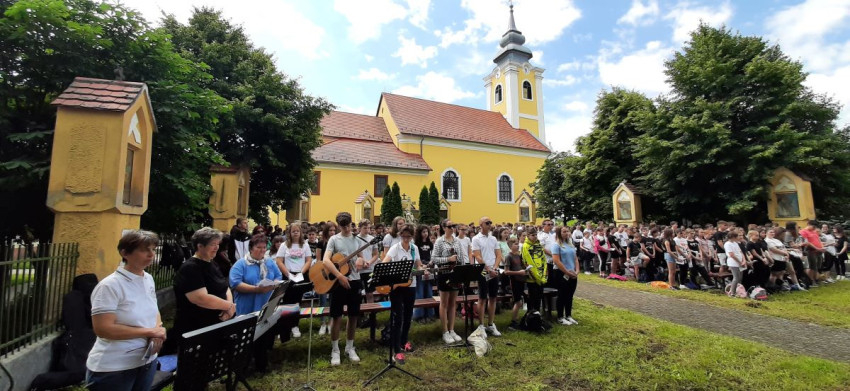 A Mosolygó Szűzanyához a vincés diákok gyalogosan és kerékpárral érkeztek, és először imát mondtak a kegytemplomban Radó Tamás püspöki helynök vezetésével. 10.30-kor szabadtéri szentmisén vettek részt, melyet Szaradits József mutatott be. A szentmisében Németh László lelkipásztori kisegítő és Bakodi Luca 8.B osztályos tanuló ismertették az osli Mosolygó Szűzanya történetét Nehéz Ferenc feldolgozásában.