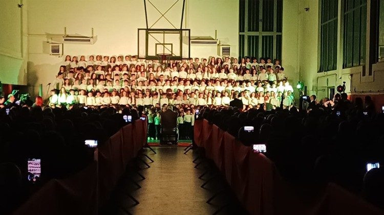 A gyermekek, mind farmerben és fehér felsőben, rendezett sorban, egyenként foglalták el helyüket a lépcsőzetes színpadon. Izgatottan és mosolyogva kezdtek énekelni, és néhányan kézmozdulatokkal kísérték az énekeket, jelnyelven is kifejezve az ének mondanivalóját. Az Adeste fideles, a Joy to the world, a Noël Noël és az Astro del ciel dallamai és szavai betöltötték az ünnepélyesen feldíszített tornatermet, amely zsúfolásig megtelt szülőkkel, tanárokkal, az iskola dolgozóival, sőt jelen volt még Vincenzo Viva, Albano püspöke, Giordano Piccinotti, az Apostoli Szék Vagyonkezelőségének elnöke, valamint a pápa, aki az első sor közepén foglalt helyet.