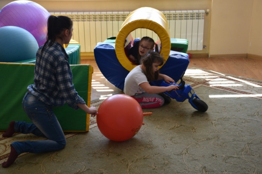 A telken található legnagyobb épületben egy rehabilitációs központot hoztak létre, ahol különböző testi és szellemi fogyatékkal élő gyerekekkel foglalkoznak. Az intézmény bejárós rendszerű: minden reggel egy kisbusz szedi össze a gyerekeket, akár a környező falvakról is, és délután a szülők viszik haza őket. Helyi viszonylatban ez a központ hatalmas lehetőség az érintett családok számára. A központban két nagyobb termet alakítottak ki játékra, egy tanteremben pedig általános iskolai oktatást folytatnak a gyerekek képességeihez igazítva. „Korán indul a nap a központban. A gyerekek, jelenleg kilencen, már fél hétkor itt vannak, először a tanárnő foglalkozik velük, és egy kis tanulás után együtt töltjük a napot. Igyekszünk fejleszteni a gyerekek szociális képességeit, valamint próbáljuk rávezetni őket arra, hogy megtanulják ellátni magukat. Ma is már játszottunk kicsit, gyakoroltuk a kézmosást és a tisztálkodást. A mi feladatunk, azt hiszem, arról szól, hogy ezek a gyerekek érezzék: a szüleiken kívül is vannak olyan emberek, akik szeretik őket, törődnek velük” – mutatta be a központ napirendjét vezetője, Jackánics Magdolna.