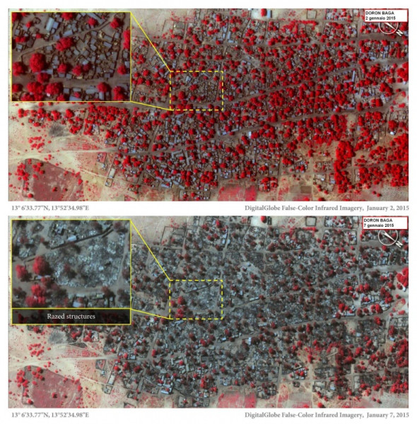 Az első felvétel a támadás előtt, a másik utána készült. A piros szín mutatja, hol virágzik az élet, merre mozognak, laknak, dolgoznak emberek. A szélsőségesek majdnem négyezer épületet romboltak le, meg nem erősített hírek szerint kétezer halálos áldozata van a támadásnak. A Bagát ért támadást követő napokban gyermek öngyilkos merénylőkről érkeztek szörnyű hírek az országból: gyermekekről, akiket arra képeztek ki, hogy a piactereken robbantsák fel magukat, elhitetve velük, hogy ezzel a mennybe kerülnek.
