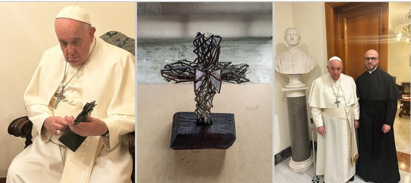 Három nappal az ukrajnai háború kezdetének évfordulója, február 24-e előtt Ferenc pápa zárt körű audiencián fogadta Vjacseszlav Hrinevics SAC atyát, az ukrajnai Caritas-Spes ügyvezető igazgatóját. A találkozón jelen volt a Caritas Internationalis (Nemzetközi Karitász) ideiglenes adminisztrátora, Piero Francesco Pinelli és asszisztense, Maria Amparo Alonso Escobar asszony is. A beszélgetés során Vjacseszlav atya betört ablakból készült keresztet ajándékozott a Szentatyának.