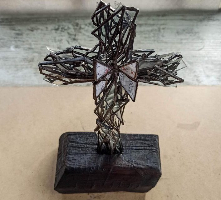 „Ezt a keresztet az egyik művész munkatársunk készítette. A betört ablakok töredékeiből készült kereszt azokat a borzalmakat mutatja be, amelyeket a televízió képernyőjén látunk – magyarázta az ajándék jelentését Hrinevics atya. – A háború gyakran az ablakokon keresztül tör be az emberek életébe, és csak az álmok, az otthonok, sőt, az életek töredékeit hagyja csak hátra. A lelkünk ablakait is betöri a háború. De ebben a keresztben ott van a remény is – egy pillangót helyeztek el benne, ami a régi értelmezés szerint a feltámadt Jézust szimbolizálja. A lepke szárnyában egy füzetlap darabkája látható, amelyre szerelemről szóló szöveg van írva. Mindez a remény jele, hogy ennek a borzalomnak igazságos béke lesz a vége.”