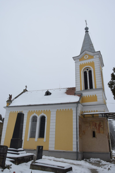 A temetőkápolna délkeletről, a hajó keleti falán és a szentély déli és keleti falán restaurált középkori falképekkel