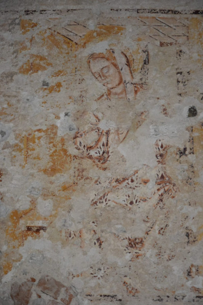 A középkori falkép részlete a szentély homlokfalának déli szakaszán: Szűz Mária az Angyali üdvözlet jelenetből