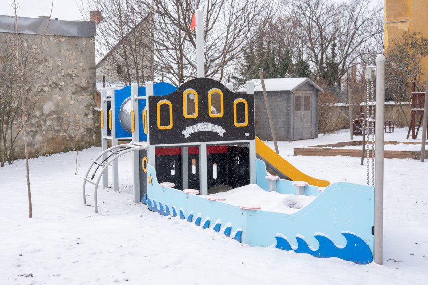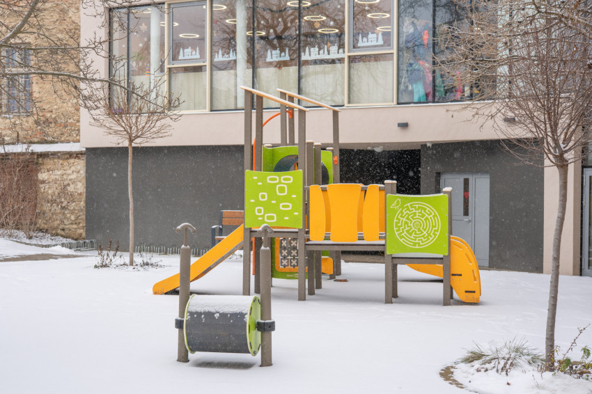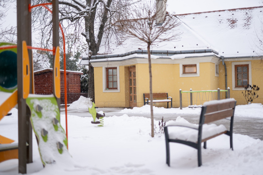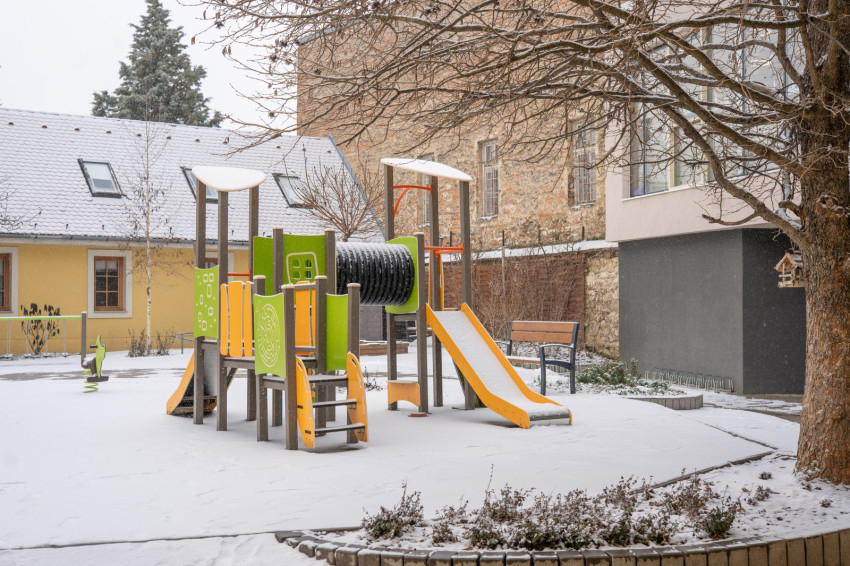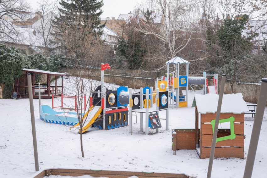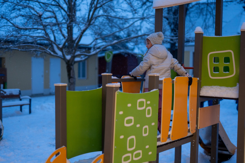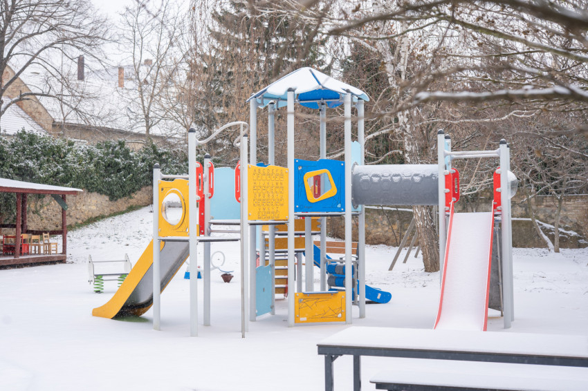 Ezen a délutánon sűrűn hull a hó. A gyerekek azonnal birtokba veszik a játékokat, szüleik és az óvó nénik vigyázzák a csúszdázókat.