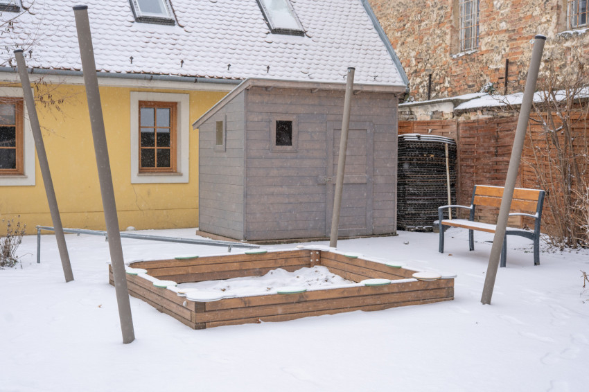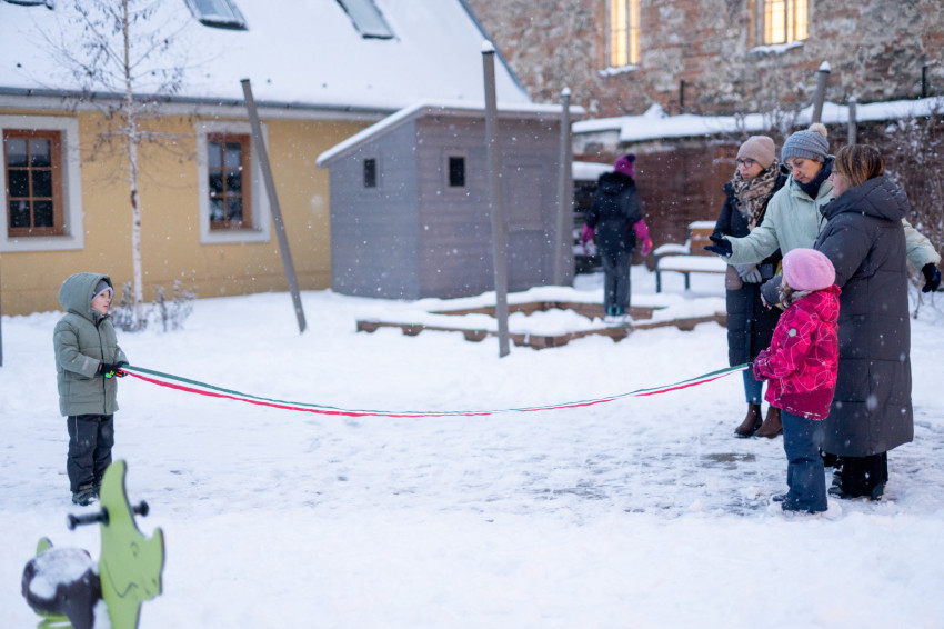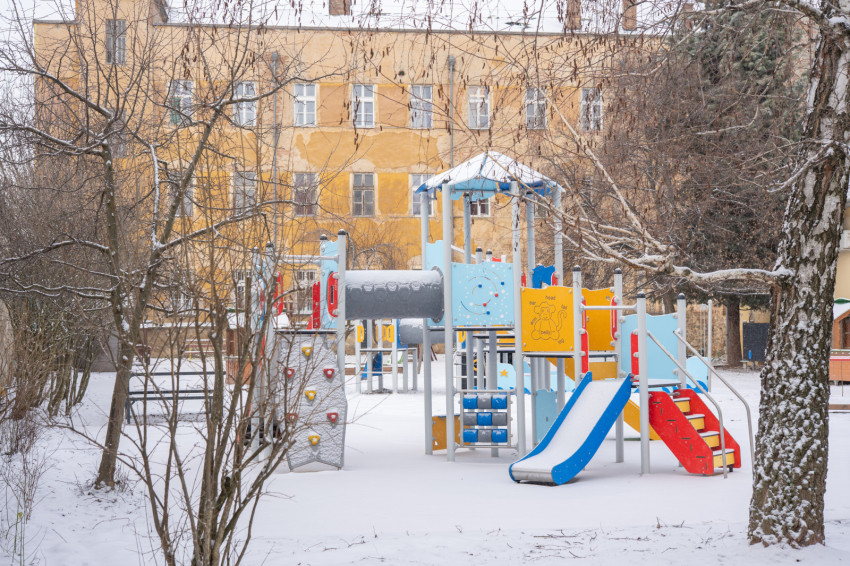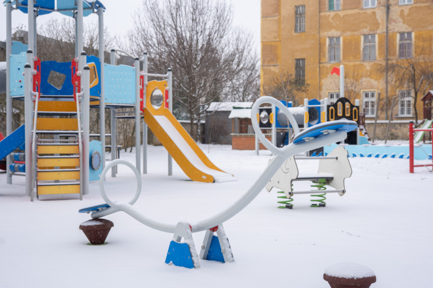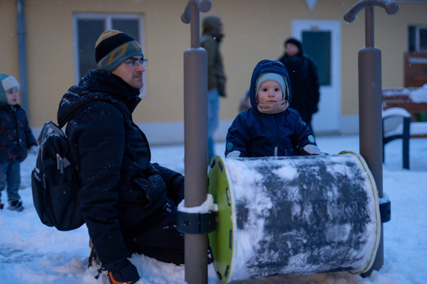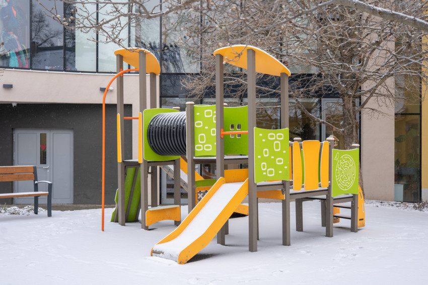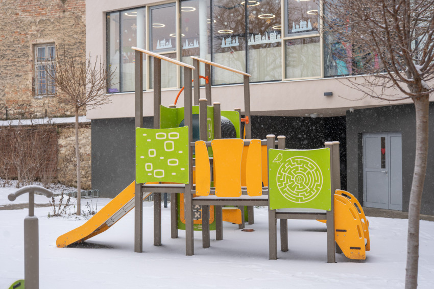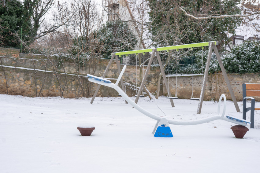 Ezen a délutánon sűrűn hull a hó. A gyerekek azonnal birtokba veszik a játékokat, szüleik és az óvó nénik vigyázzák a csúszdázókat.