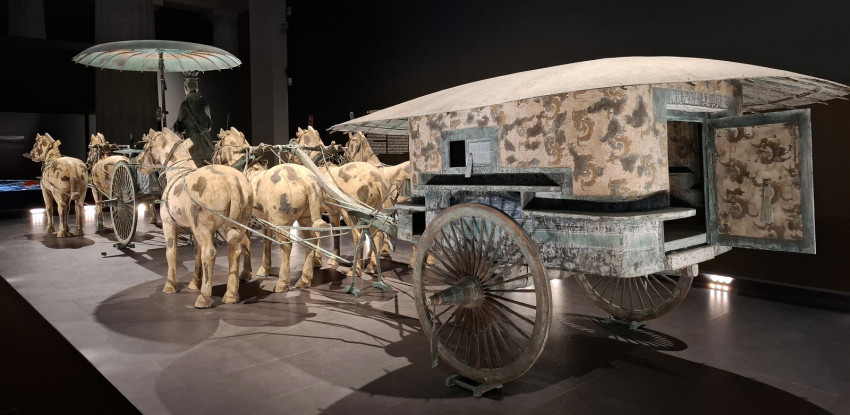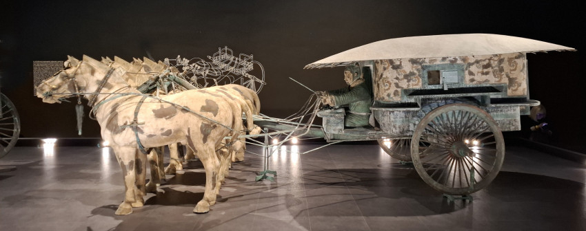 A négy-négy ló húzta kocsik az életnagyságú eredeti leletek felére kicsinyített másai. Az idők folyamán a teljes leletegyüttesre rászakadt a föld, így a kocsik, csakúgy, mint ahogyan a terrakotta katonák is, apró darabokra törve kerültek napvilágra a feltárás során. A kocsik esetében a régészek úgy döntöttek, hogy a leleteket földlabdával együtt emelik ki megtalálási helyükről, és egy hatalmas faládában hozzák felszínre. Ezek után egyenként megtisztították a kocsik és lovak apró darabjait, majd szép lassan összeállították a műtárgyakat. Amint a kiállításon megtudtuk, a rekonstrukció nyolc évig tartott. A nyitott kocsi 1983-ban, a zárt kocsi 1988-ban készült el. Később a pontos másolataikat is elkészítették, ezek láthatók a mostani kiállításon is. E műtárgyak bronz, arany és ezüst felhasználásával készültek.