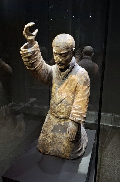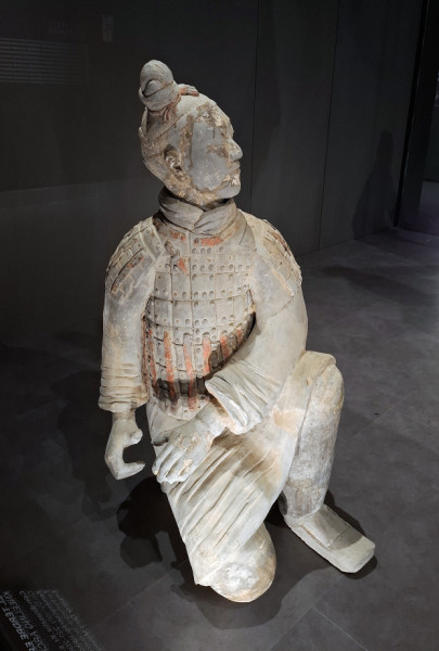 Életnagyságú égetettagyag (terrakotta-) szobrok érkeztek nemrég a Szépművészetibe. Nem csoda, hogy üvegkalitkába zárták őket, hiszen rendkívül törékenyek ezek a portrészerű, élethűen kidolgozott alkotások. Bár az ázsiai embereket mi, európaiak gyakran „egyformának” látjuk, ha közel megyünk a terrakotta alakokhoz, és jól megnézzük őket, tapasztalhatjuk, hogy bizony nagyon is egyediek az arcvonásaik. Még a páncélzatuk sem teljesen egyforma, s a hajuk és a fejfedőjük is különböző.