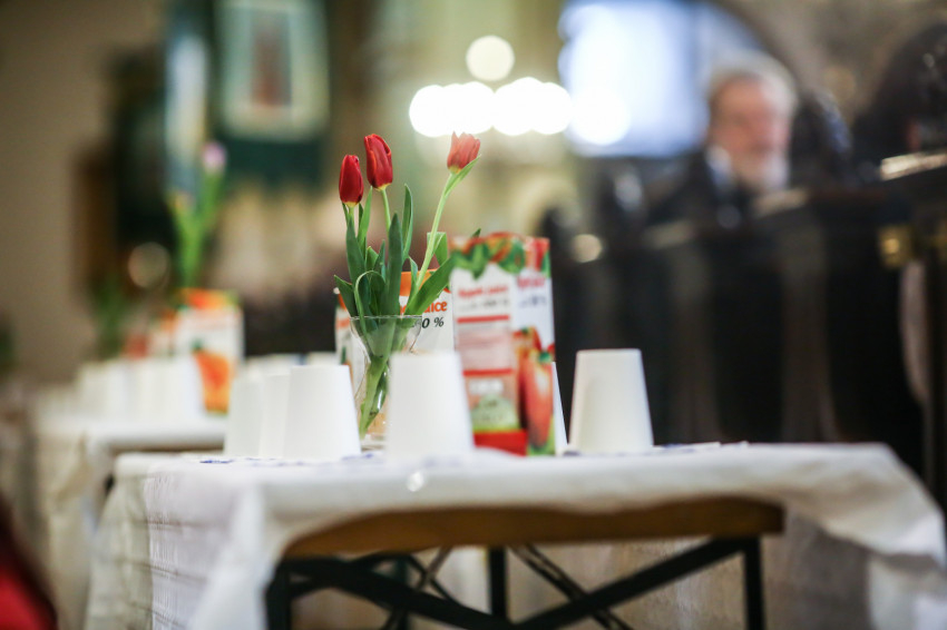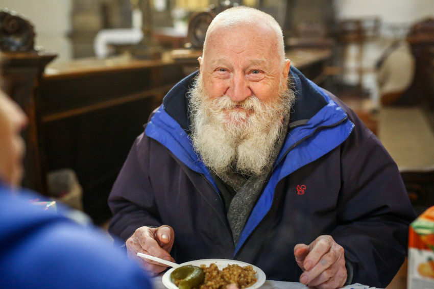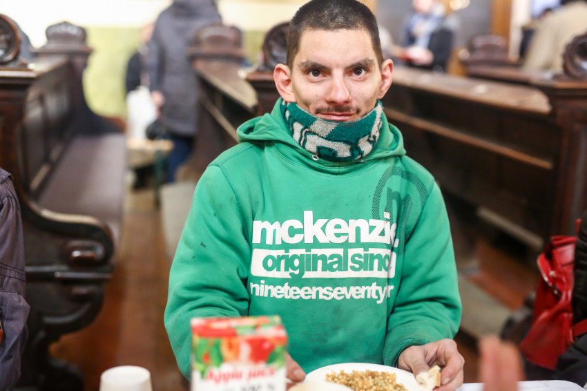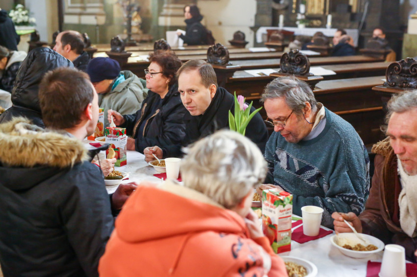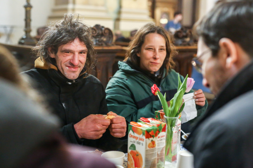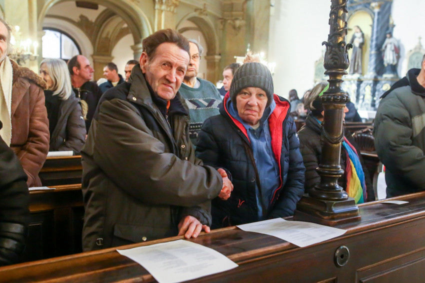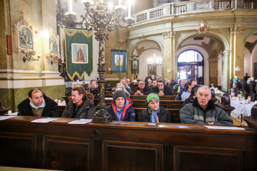 Kérjük Istent, hogy bocsássa meg, amikor közönyösek voltunk, és életünk legyen tanúságtétel, hogy a szívünkben Isten szeretete felébresztette az emberek iránti szeretetet – zárta homíliáját Mohos Gábor püspök, aki koncelebráló paptársaival – Michels Antal plébánossal és Gájer Lászlóval, a Pázmány Péter Katolikus Egyetem Hittudományi Karának tanszékvezető tanárával – együtt leült a templomban ókeresztény módra, az oltár meghosszabbításaként megterített asztalokhoz, hogy együtt ebédeljen a hajléktalan, szegény emberekkel, akik eljöttek a szentmisére, hogy megemlékezzenek sorstársaikról, barátaikról, családtagjaikról.