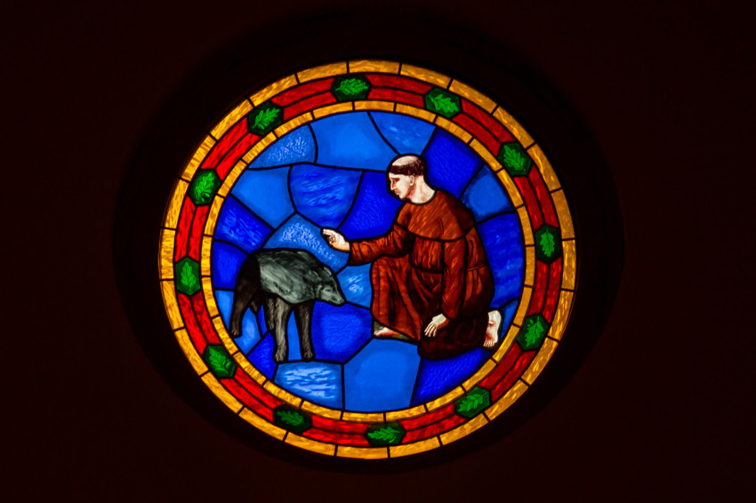 Az ólombetétes üvegablakokat a Kecskeméten élő Holtság Károly ólomüvegmester tervezte és készítette. Szent Ferenc Virágoskert című írásából ismerjük a történetet, amikor jó útra térítette a gubbiói farkast. Ezt jeleníti meg a bejárat feletti ablak.