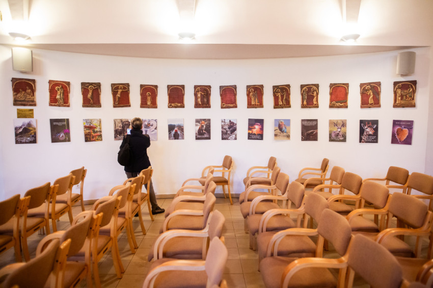 A beltéri kerámiastációkat – amelyek megrendelésre készültek egy dunántúli faluba, de végül adományként kerültek ide – Magyar Márta keramikus iparművész készítette Budapesten.