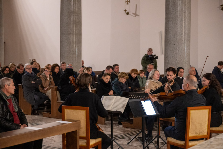 A zeneszerető közönség megtöltötte a bencések római főtemplomát, ahol Hortobágyi T. Cirill pannonhalmi főapát mondott köszöntőt, aki egy ökumenikus küldöttség vezetőjeként érkezett szentévi zarándoklatra az Örök Városba december 9-én. Az ünnepi koncerten jelen volt Törő András, a Pápai Magyar Intézet (PMI) rektora, Fehérváry Jákó OSB, a római Szent Anzelm Pápai Egyetem rektora és Vértesaljai László SJ, a Vatikáni Rádió magyar adásának vezetője.