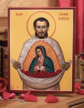 Visszatérőben a dombon Mária újra megjelent és ismét küldte Juant, akitől a püspök ezúttal égi jelet kért a jelenés hitelessége bizonyítására. December 12-én a Szűzanya jelül virágokat küldött a püspöknek, melyeknek átadásakor a köpenyen, melyben a virágokat Juan az ölében vitte, csodálatos módon megjelent Mária képe, s még aznap az Istenanya megjelent Juan halálosan beteg nagybátyjának és meggyógyította.