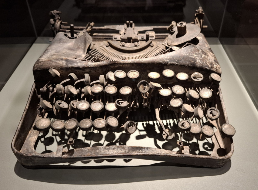 Most pedig elérkeztünk a remek kiállítás központi részére: az a bizonyos lebombázott írógép következik, amire a címben is utaltunk. A tárlat e kitüntetett fontosságú terében az írógép mint jellemző használati eszköz áll. A 20. század folyamán sokan dolgoztak már írógéppel. Jókai még nem, de Gárdonyi Géza már igen, hogy csak ezt a két példát említsük. Húsz írógépet nézhetünk meg itt, és azt is megtudhatjuk, hogy annak idején ki írt rajtuk. Jókai Anna, Márai Sándor, Déry Tibor, Szerb Antal, Csukás István és még sok más író, szerző gépe látható a teremben. A legdíszesebb Móricz Zsigmondé, jó állapotban van.