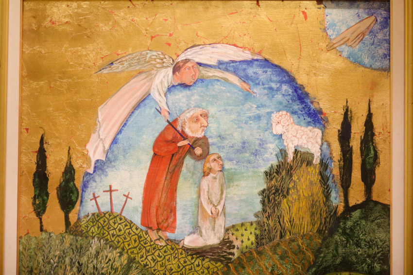A fehér kis bárány, Krisztust jelképezve, öntudatosan, az életáldozatot vállalva áll a közeli szikla ormán. Mindez az isteni gondviselés körkörös, zárt világában történik, az Isten országát jelképező, káprázatos arany háttér előtt. Jobbról megjelenik a történést irányító Úristen jobbja; a távolban pedig feltűnik a Golgota három bitófája is, jelezve, hogy Ábrahám áldozata csak előkép Jézus, az Isten Fia életáldozatához, melyet az Atya enged és elfogad az emberiség bűneinek megváltásáért. Isten azonban nem kíván ilyen nagy áldozatot az embertől. Ábrahám azóta is, közel négyezer éve a hősies istenszeretet példaképe. Mindezeket a gondolatokat a kép remekművű szerkezeti felépítése, a formák és a színek expresszivitása, festői szépsége és tisztasága közvetíti a néző felé – magyarázta Prokopp Mária.