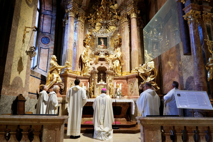 A szentmise végén Veres András püspök a paptestvérekkel együtt a Könnyező Szűzanya kegyoltára előtt Mária-köszöntőt imádkozott.