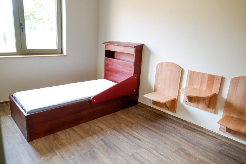 Egy- és kétágyas szobáik ajtaját arcfelismerő nyitja, biztosítva a személyes biztonságot – magyarázza Giflo Péter. A bútorzat kifejezetten ide készült, masszív az ágy, rögzítettek a bútorok, bírják akár a rugdosást, rohamokat. Mindenkinek van szekrénye, ezek polcait úgy alakították ki, hogy ne lehessen rá felmászni. A tévé magasra került, plexit is terveznek tenni elé. Az ágy és szekrény színe összetartozik, így a szín is köti őket a lakóhoz, akik érezhetik, ez a sajátjuk.