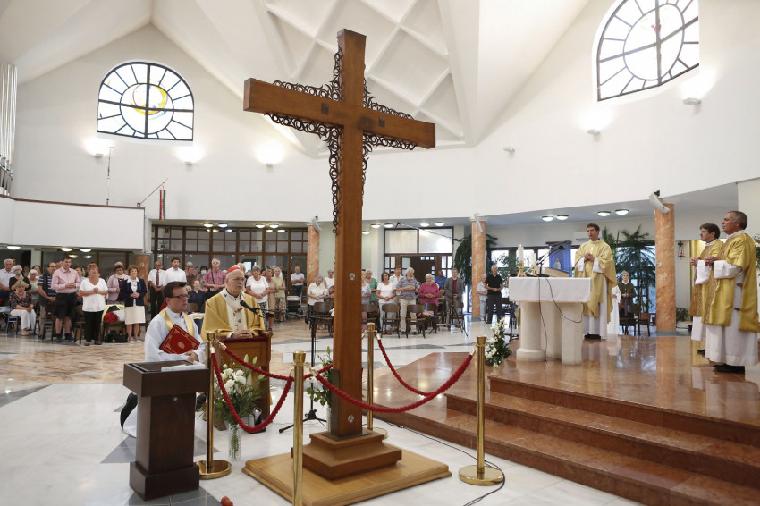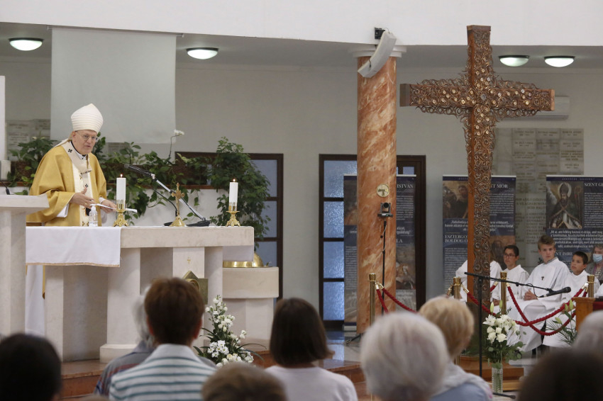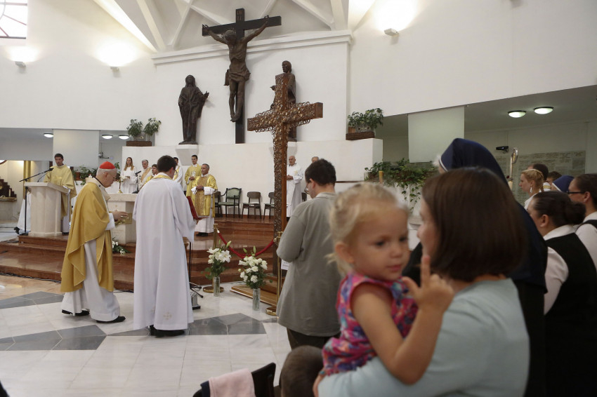A mai szentmisét a Szent Kereszt tiszteletére végezzük. A Nemzetközi Eucharisztikus Kongresszust előkészítő több éves missziós folyamatnak ez a záró állomása. A kezdet még a püspöki kar római ad limina látogatásakor volt, a vatikáni apostoli palotában. Ferenc pápa ott áldotta meg a Missziós keresztet, amelyet azután városról városra, templomról templomra hordoztunk hazánkban és szerte a Kárpát-medencében. Eleinte a legismertebb magyar szentek ereklyéit foglaltuk a keresztbe, később újabb és újabb boldogok és szentek ereklyéi járultak hozzájuk, főleg a 20. század vértanúinak maradványai. Ahogyan a kereszt a szomszédos országokban is megjelent, az ottani egyházmegyék kérték, javasolták, máskor mi magunk kezdeményeztük, hogy annak a vidéknek a szentjei is képviselve legyenek Missziós Keresztünkben. Hiszen ők már együtt vannak, együtt kérik Isten irgalmát országainkra és népeinkre. Az egyes szentek életrajzát is összegyűjtöttük.