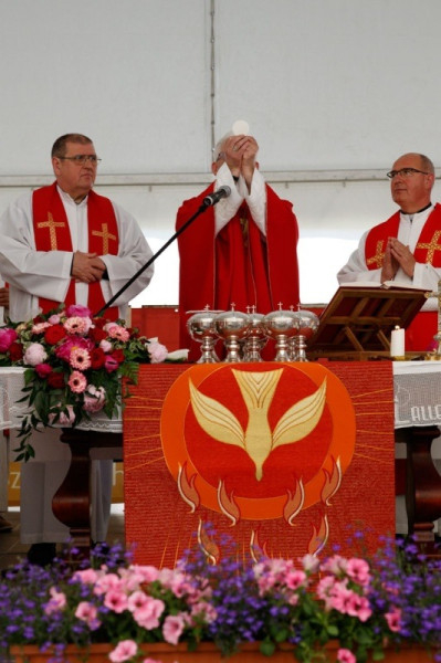 A főpásztor ezután arról beszélt, hogy az apostolok tanúságtétele az imádságból fakadt. Képesek voltak az imádság által, a Lélek erejével a gyalázatot, az üldöztetést is elszenvedni, életüket odaadni. Nekünk is a Szentlélek vezetésére kell bíznunk életünket, aki képes új szívet és új lelket adni nekünk, hogy felelősséggel tudjuk formálni és alakítani a világot. Rajtunk múlik, hogy átadjuk-e lelki-szellemi értékeinket gyermekeinknek, hogy milyen Egyházat építünk a jövő nemzedéke számára.