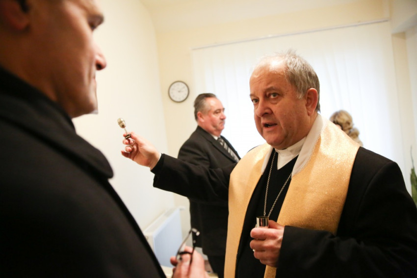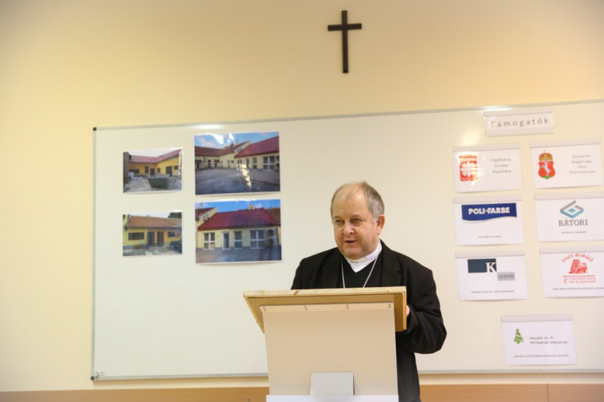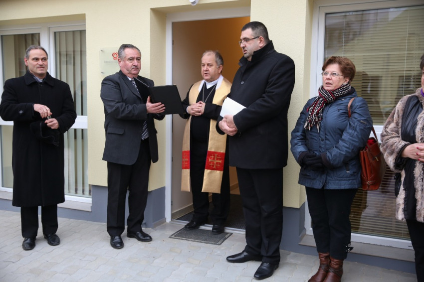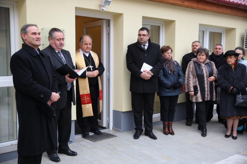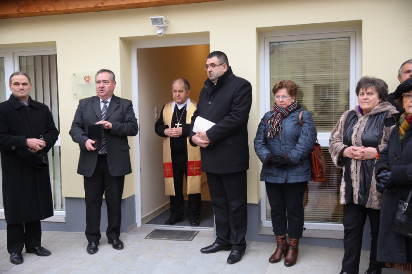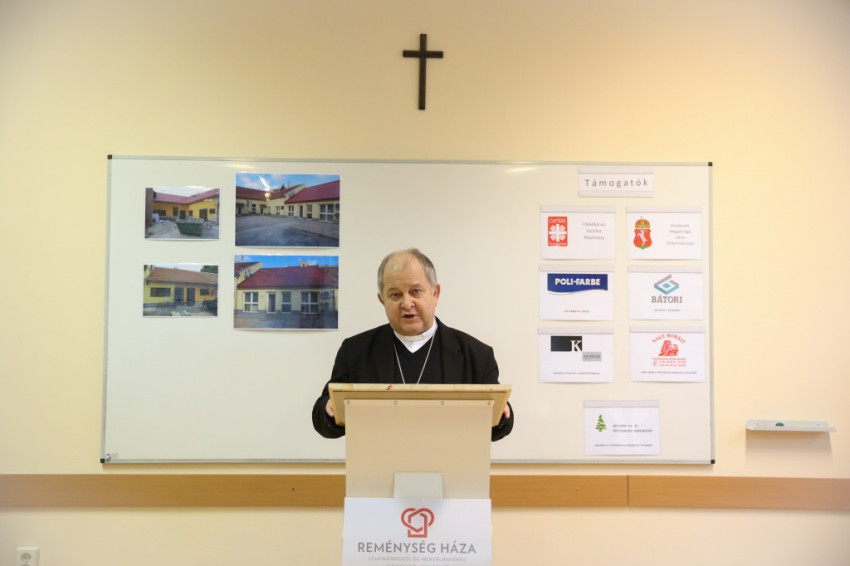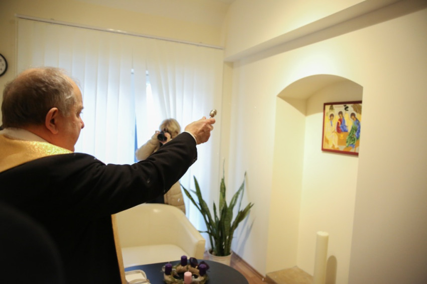 Megérkezik Bábel Balázs érsek. Mindannyian összegyűlünk a hideg-rideg udvaron, de csak néhány pillanatra, hogy a rövid üdvözlés és ima után szimbolikusan birtokba vegyük a házat, amely mostantól mindenkit nyitott ajtóval vár. „Urunk, áldd meg a munkatársakat, akik tanácstalan vagy csapások áldozataivá vált emberekért próbálnak tenni” – imádkozza az érsek, majd megáldja az intézményt és a Szentháromság-ikont. Nem sokkal később pedig rövid beszédet mond. Főként arról a nagy felismerésről beszél, amely a gyógyítás történetében az ember testi-lelki egységére vonatkozott, és arról a nagy-nagy reménységről, amelyet hitünk részeként testi feltámadásunkba vetünk. A reményről, amelyre minden embernek mindennap szüksége van, és amihez sokszor egymást kell hozzásegítenünk. Végül az egyház szociális tanítására tér ki, és arra, hogy az egyházi szociális intézmények mennyi szakértelmet, energiát vetnek latba a didergő világ érdekében.