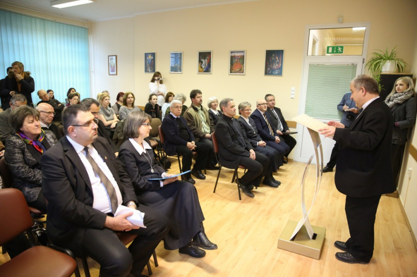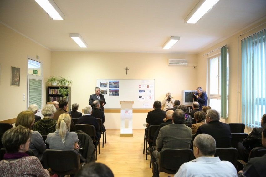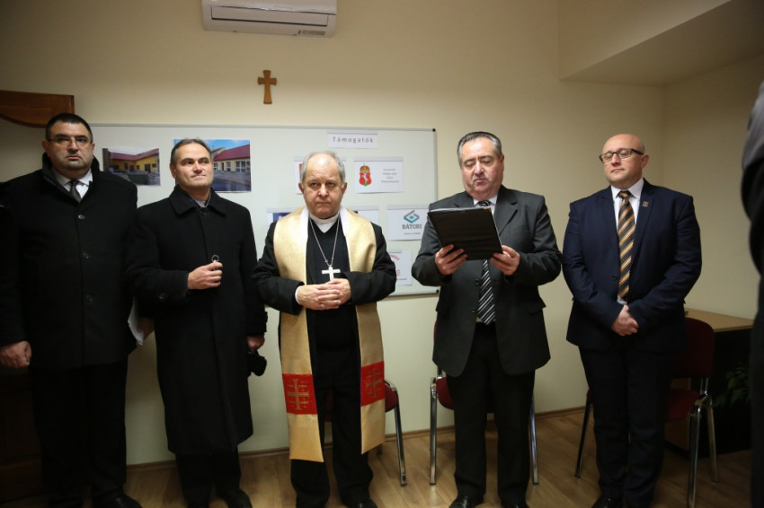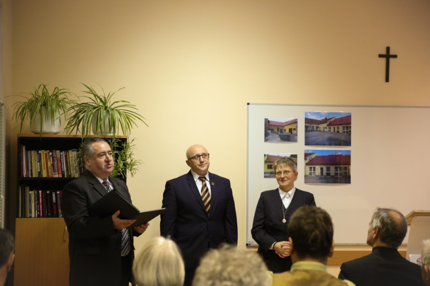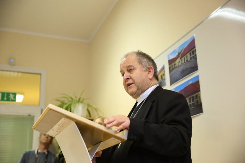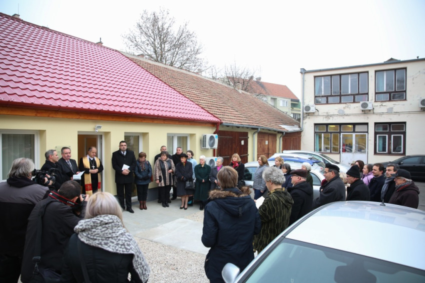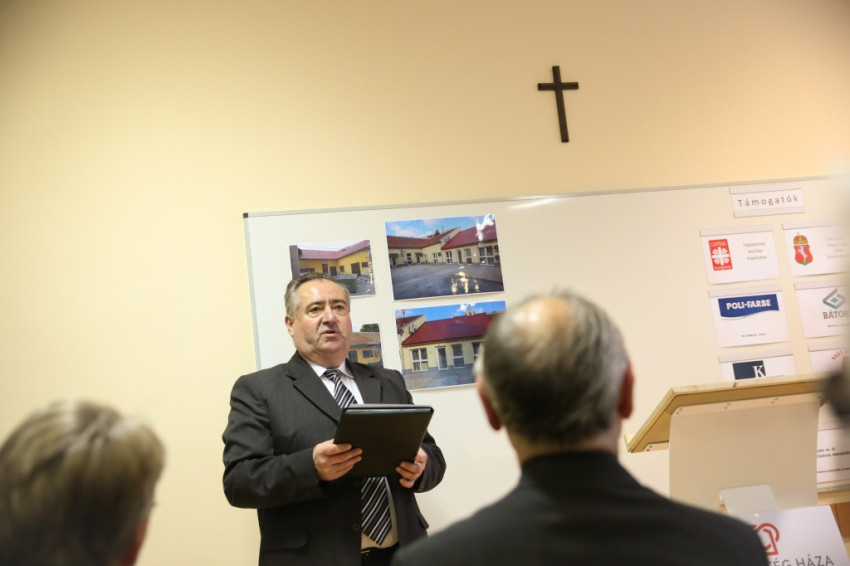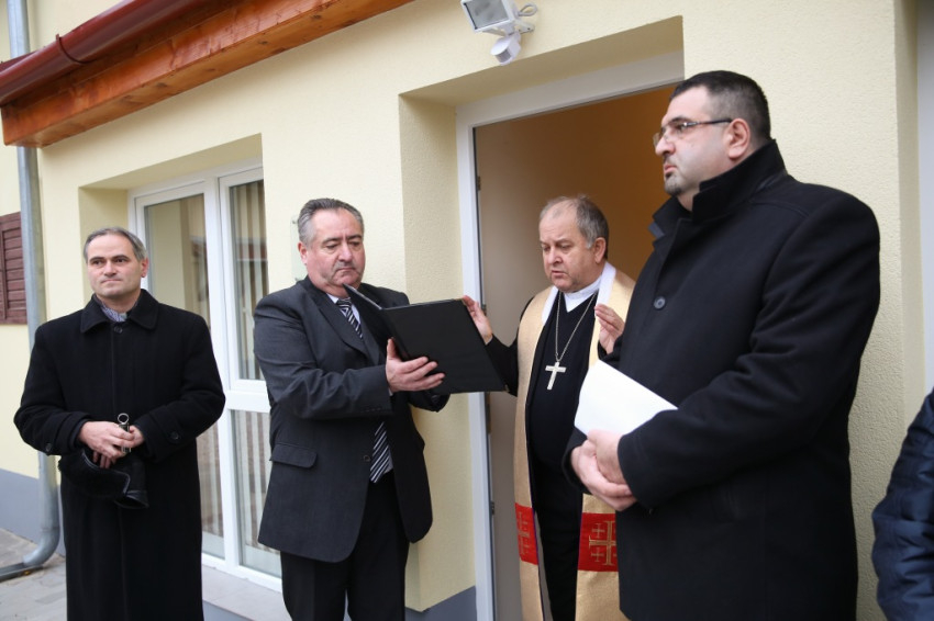 Megérkezik Bábel Balázs érsek. Mindannyian összegyűlünk a hideg-rideg udvaron, de csak néhány pillanatra, hogy a rövid üdvözlés és ima után szimbolikusan birtokba vegyük a házat, amely mostantól mindenkit nyitott ajtóval vár. „Urunk, áldd meg a munkatársakat, akik tanácstalan vagy csapások áldozataivá vált emberekért próbálnak tenni” – imádkozza az érsek, majd megáldja az intézményt és a Szentháromság-ikont. Nem sokkal később pedig rövid beszédet mond. Főként arról a nagy felismerésről beszél, amely a gyógyítás történetében az ember testi-lelki egységére vonatkozott, és arról a nagy-nagy reménységről, amelyet hitünk részeként testi feltámadásunkba vetünk. A reményről, amelyre minden embernek mindennap szüksége van, és amihez sokszor egymást kell hozzásegítenünk. Végül az egyház szociális tanítására tér ki, és arra, hogy az egyházi szociális intézmények mennyi szakértelmet, energiát vetnek latba a didergő világ érdekében.