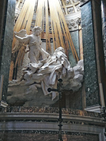Iskolai tanulmányaimból, a művészettörténetből és az internetről régóta ismerős volt számomra ez a műalkotás. Ám Róma templomában eredetiben látni óriási élményt jelentett. A szobron látszik, hogy nemrég restaurálták, Teréz elomló alakja vakítóan fehér. Az aranyszínű sugárnyalábok fölött elhelyezett erősen világító spotlámpa tökéletesen megmutatja a ruha redőit, a szobor plaszticitását. Ez az árnyalatokban gazdag látvány, a hullámzóan könnyed, fényesre csiszolt felületek elképesztő hatással vannak a nézőre. Zarándokcsoportunk tagjait, az angyalföldi Szent Mihály-plébánia híveit is lenyűgözte a látnivaló, a gyerekeket éppúgy, mint a társaság felnőtt tagjait.