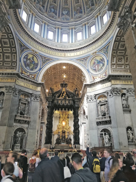 A San Pietro belsejében a Szent Péter sírja fölött magasodó úgynevezett baldachin, a 29 méter magas, csavart oszlopokra támaszkodó oltársátor is az ő műve. A templomban VIII. Orbán pápa síremlékét is ő faragta ki márványból, és persze munkatársai, hiszen ahogyan Michelangelo, úgy ő sem bírta volna a sok munkát egyedül. Bernininek is komoly műhelye volt. A főtemplom előcsarnokában jobb oldalt megcsodálhattuk Nagy Konstantin lovas szobrát, amelyet szintén a barokk mester készített.