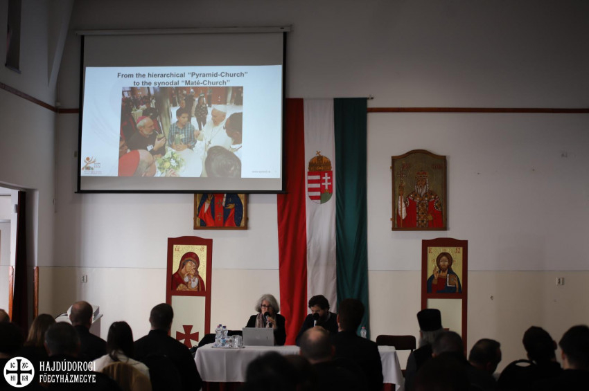 A közös ebéd után a Szent Bazil Oktatási Központ aulájában Nathalie Becquart XMCJ nővér angol nyelvű előadását – tolmácsolás mellett – hallgathatták meg a résztvevők.
