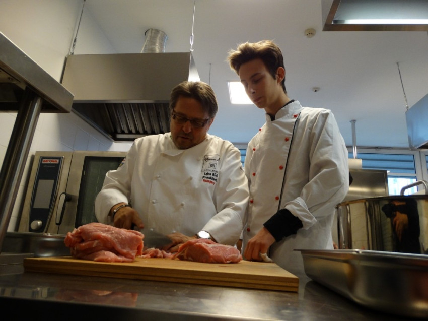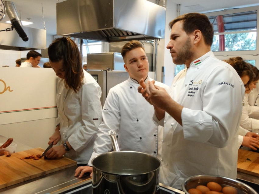 A tizenhárom tanuló három csoportban három különböző menüsort készített el a mesterszakácsok irányításával. „Sztenderdizáljuk a főzést, tehát a fiatalok elvégzik az általam adott feladatokat. A klasszikus rántott hús, sült krumpli fogás mellett fűszeres pirított mangalicamájat készítünk” – tájékoztatta a jelenlévőket Bíró Lajos séf. Mint mondta, a gyerekek új technikákkal ismerkedhettek meg a délelőtt során, és azt is megtapasztalhatták, milyen egy séf keze alatt dolgozni. „Nagyon lelkesek a gyerekek, és most ez a legfontosabb. Volt, akinek sok minden újdonság volt, de a lelkesedés megvolt mindenkiben.”