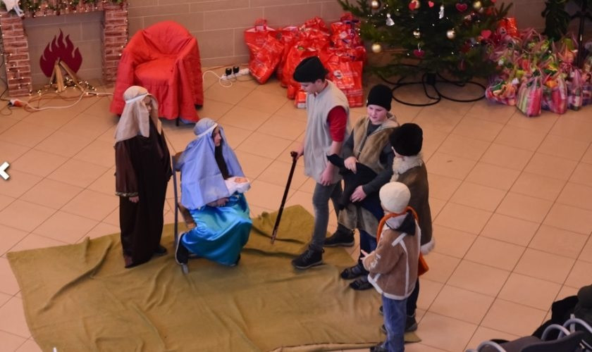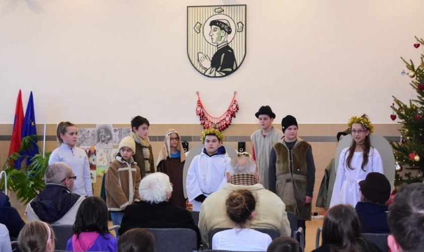 A helyi katolikus iskola aulájában tartott ünnepségen az iskola diákjai a megszületett Megváltó előtt tisztelgő pásztorok történetét játszották el.