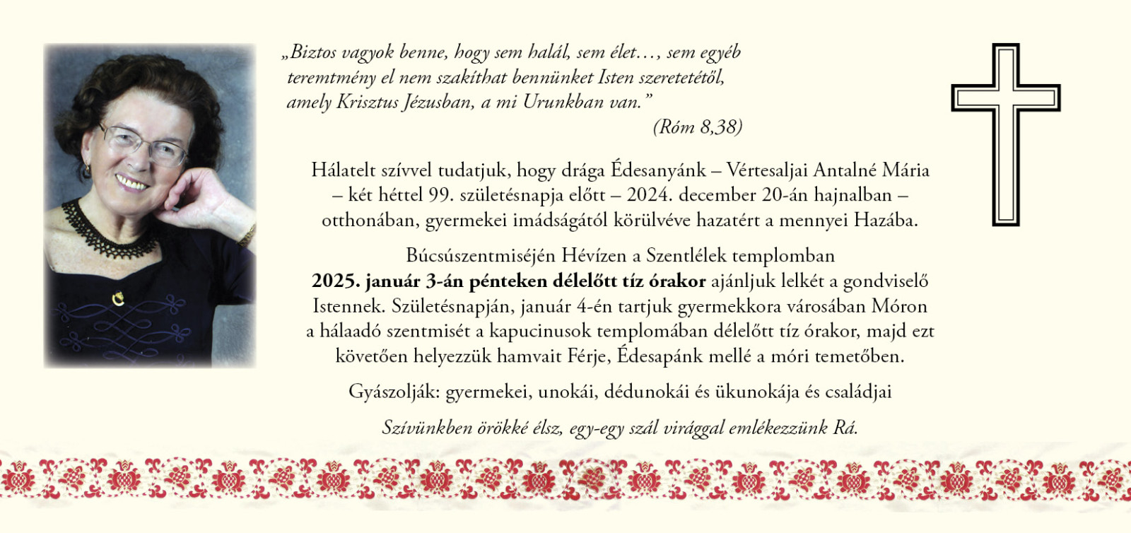 „Nem, nem fáj semmi” – felelte a kérdésünkre, és csak szelíden mosolygott. Mosolygott, és időről időre hálát adott az Istennek: „Olyan boldog vagyok, hogy itt vagytok…! Nagyon boldog vagyok, hogy ilyen jó gyerekek, unokák vagytok!” Ezek az elsuttogott szavai ott szálltak a kis szobában körbe-körbe, és csak nehezen ültek el a szívünkben, mert mi réges-régtől nagyon is tudtuk, hogy Édesanyánk, a Mami mennyire jó, de hogy éppen Ő tart minket annak, ezt csak könnyes szemmel tudtuk elfogadni.